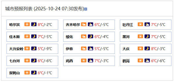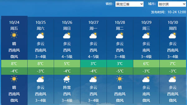 r昨天到今晨,黑龙江大部以晴为主,但寒意仍存,省会哈尔滨最高气温仅6.3℃,今晨最低气温更是只有-5.5℃,创今年下半年来新低。